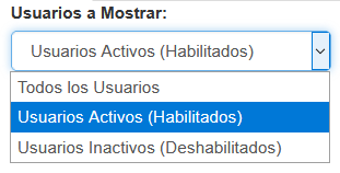 Usuarios a Mostrar Opciones de Visualización. Permite filtrar usuarios de acuerdo a su estado. Ver más detalles en Opción de Visualización
