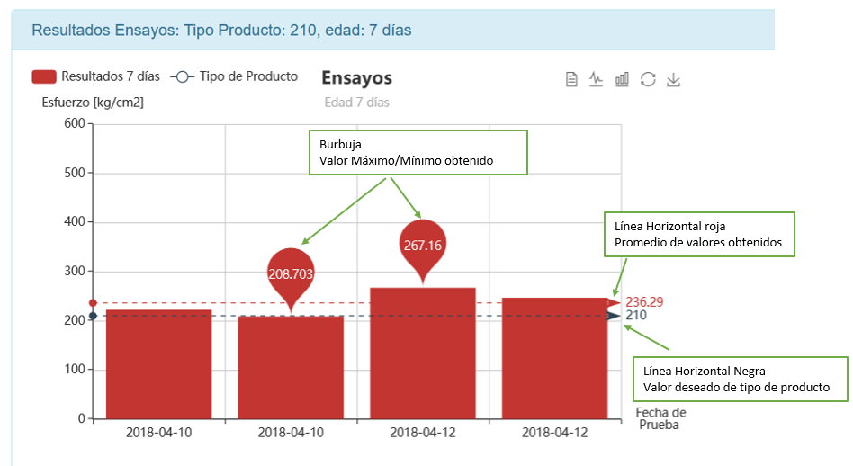 Fig 521 Gráfico de Ensayos de probetas de del tipo de producto de 210 con edad de 7 días para la orden actual seleccionada.