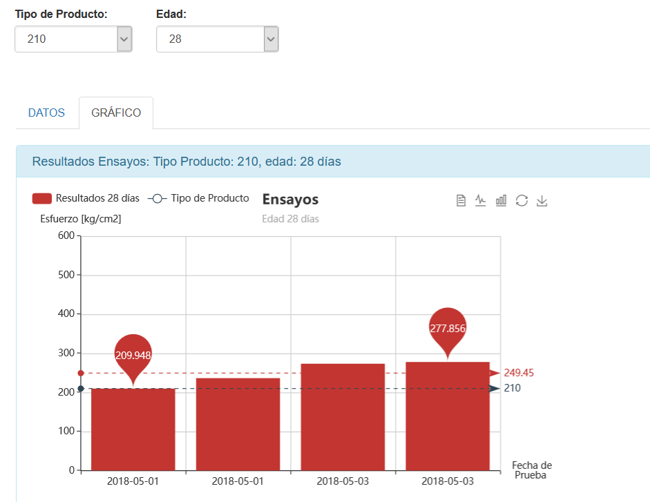 Fig 522 Gráfico de Ensayos de probetas de del tipo de producto de 210 con edad de 28días para la orden actual seleccionada.