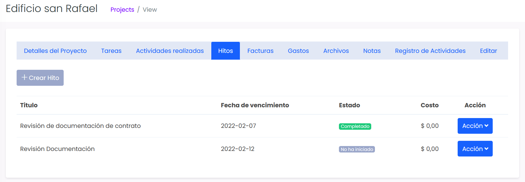 Si se selecciona la opción Hitos en el detalle de un proyecto, aparecerá un listado de Hitos definidos para este proyecto, tal como se indica en la imagen a continuación.