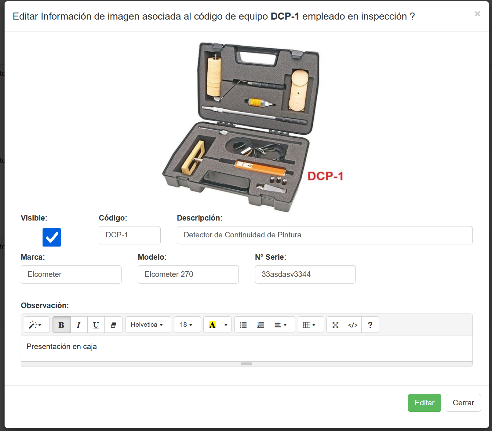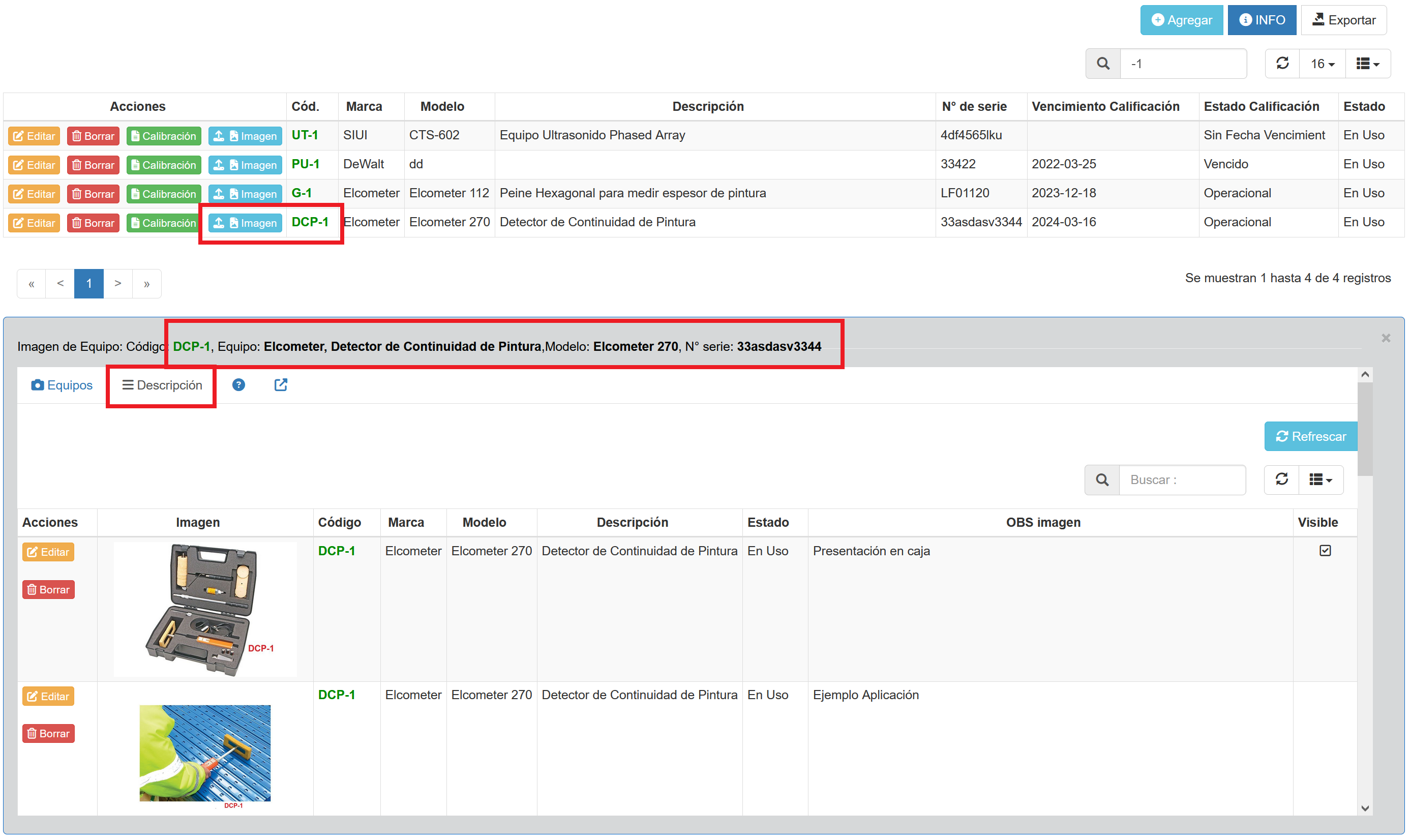 Fig 731 Extracto de pantalla, con listado de equipos de Inspección y detalle de imagen seleccionado. Pestaña Descripción de imagen activa.
