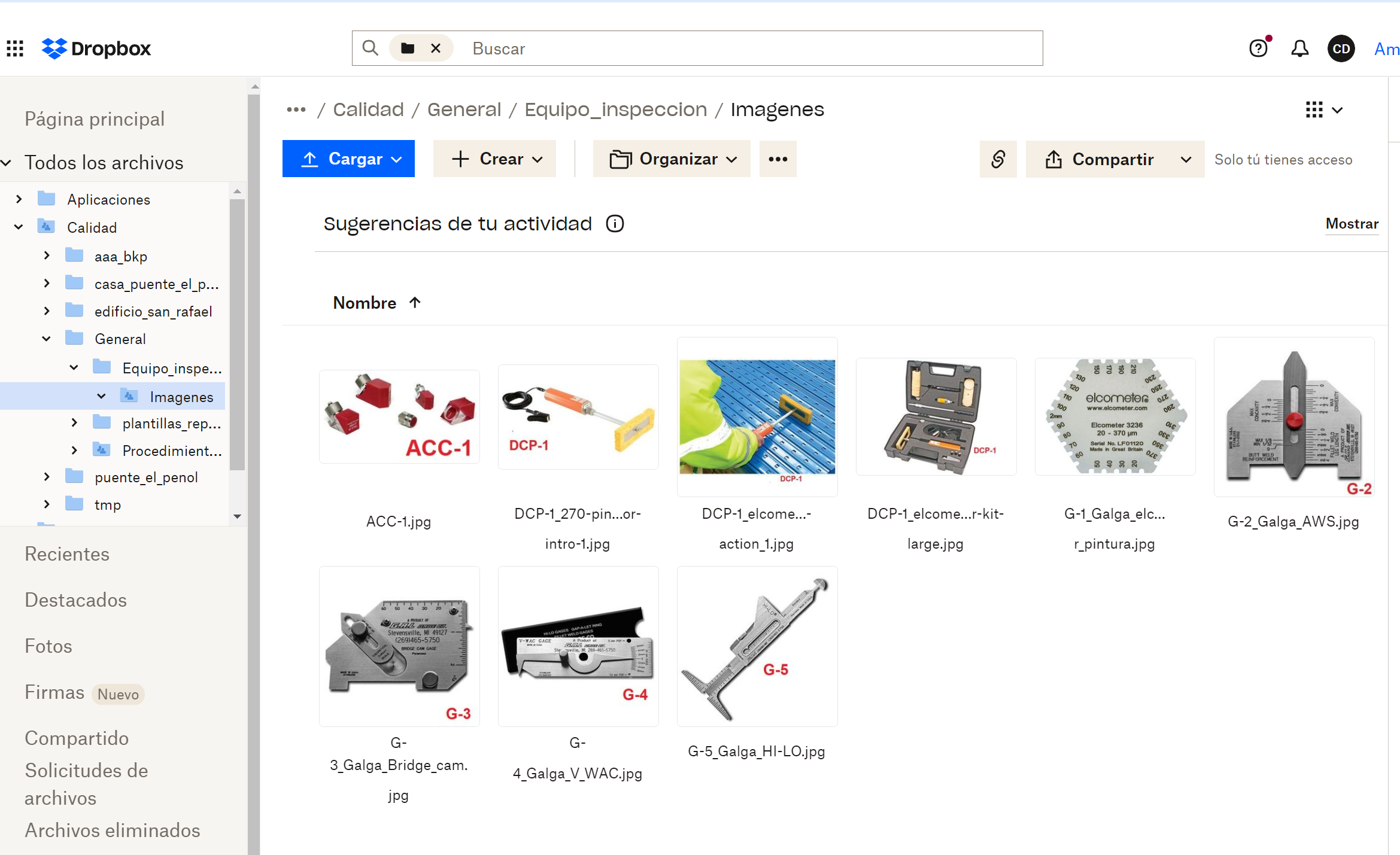 Ya en la cuenta del medio de almacenamiento remoto, en este caso Dropbox, se aprecian las imágenes en la carpeta General/Equipo_inspeccion/imagenes, tal como se muestra en la siguiente imagen