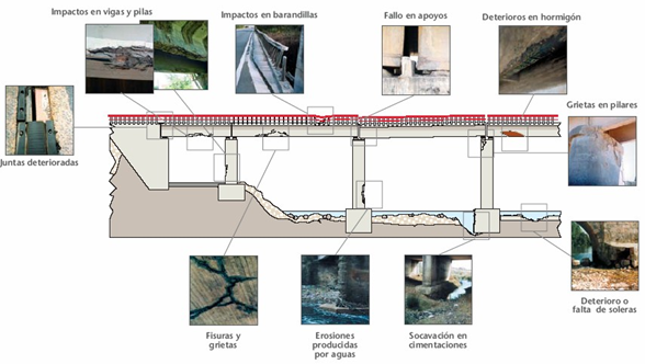 Normalmente este tipo de fallas son producidas por el impacto de vehículos en la superestructura del puente, por material que transporta el río a gran velocidad y que impacta los elementos de la subestructura del puente, o por la detonación de cargas explosivas.