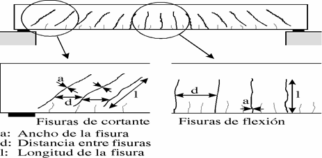 Las fisuras por flexión en una viga o una losa generalmente se presentan en la cara inferior de los elementos, se localizan en la zona central de la luz, nacen en la fibra inferior y se extienden hasta llegar al eje neutro de la sección; al principio crecen verticalmente y luego se inclinan bajo la influencia del esfuerzo cortante cuando se aproximan a los apoyos