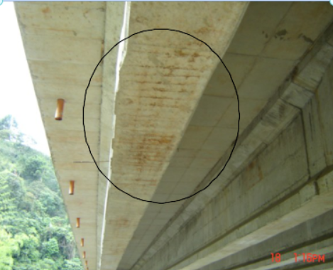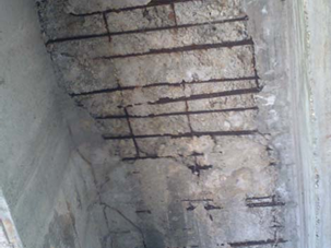 Fig 1286 Recubrimiento inadecuado en la losa, exposición del acero de refuerzo y corrosión del mismo. (Puente Q. Las Ánimas, Chocó 2006) |
