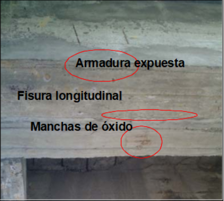 Según Red Rehabilitar [7], los daños causados por el proceso de corrosión en armaduras generalmente se manifiestan a través de: fisuras en el concreto paralelas a la dirección del refuerzo, descascaramiento y/o desprendimiento del recubrimiento. En elementos estructurales que tienen un contenido de humedad alto, las primeras evidencias de corrosión son manchas de óxido en la superficie del concreto ( ver Figura Evidencia de manchas de óxido en la superficie del concreto)