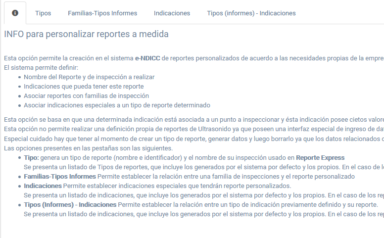 El contenido de la pestaña INFO contiene una breve información de las opciones disponibles para reportes personalizados. Es la opción por defecto, tal como se muestra en la siguiente imagen.