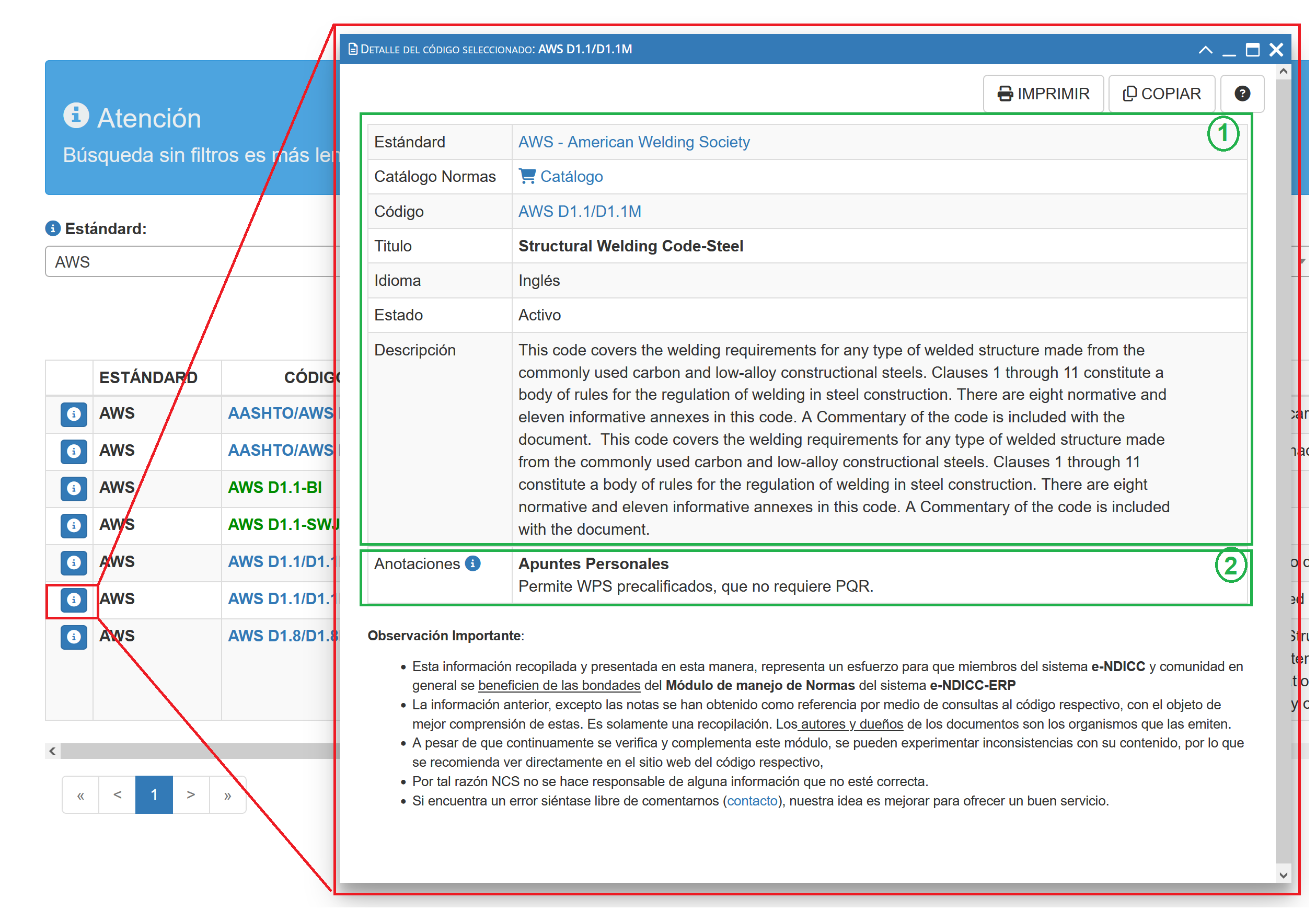 Al seleccionar el botón INFO de una determinada norma aparecerá una ventana emergente con un detalle del código seleccionado tal como se muestra en la siguiente imagen.
