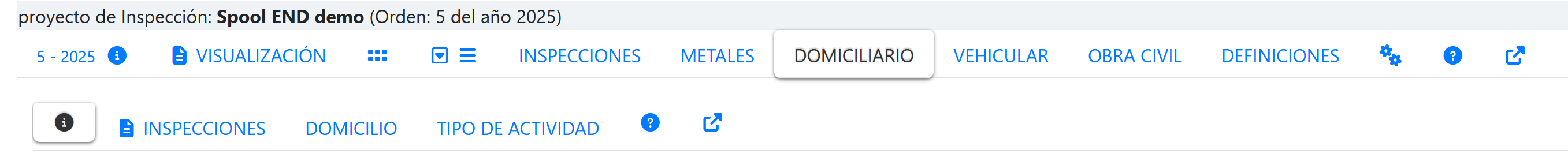 Al seleccionar la pestaña DOMICILIARIO, se mostrará una segundo nivel de PESTAÑAS que muestra la opciones que tiene esta categoría de inspecciones, tal como se muestra en la siguiente imagen