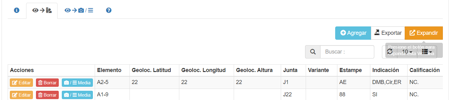 Para ésta forma inspección, una vez definido el reporte se presentará al usuario la opción seleccionar y adicionar elementos inspeccionados con sus respectivas indicaciones y atributos tal como se muestra en la siguiente imagen.
