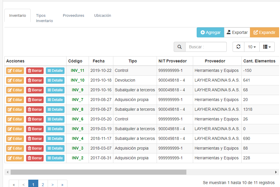 Esta opción se presenta al seleccionar la pestaña "INVENTARIO" de la opción de menú de Inventario, en ella se presenta una tabla de datos que contiene los inventarios realizados y sus respectivas opciones, tal como se muestra en la imagen a continuación.