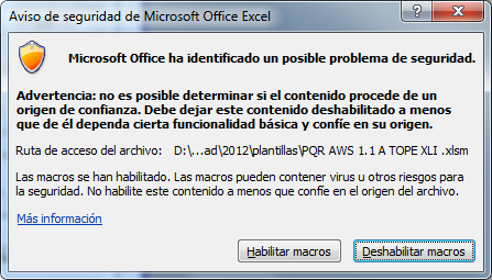 Puesto que la plantilla consta de una serie de programas, es necesario habilitar las macros para poder usarla.