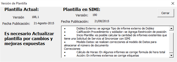 Con objeto de verificar si la plantilla es la ultima desarrollada, la plantilla tiene una opción para verificar.