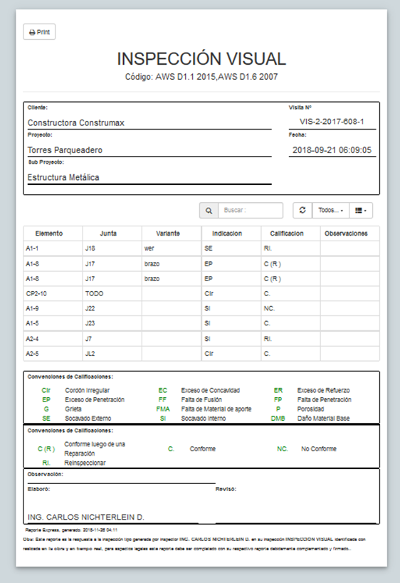 Fig 934 Detalle Inspecciones para una visita del mismo inspector que redactó el reporte.