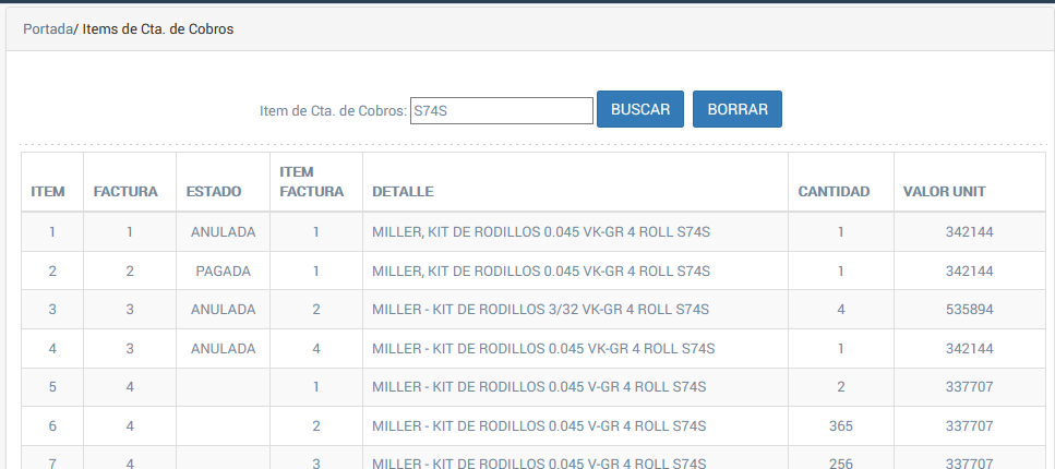 Fig 187 Resultado de una búsqueda de Item de una cuenta de cobro.