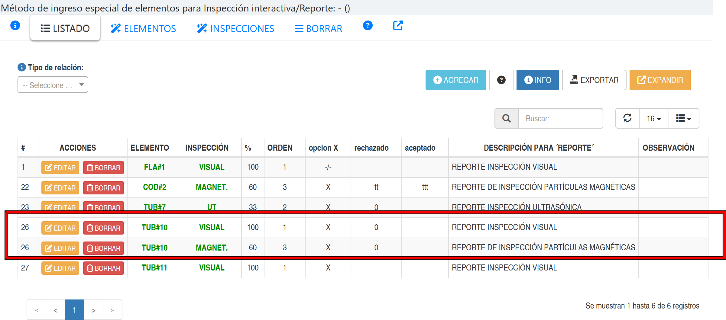 Cada fila de la tabla representa una relación entre el elemento y la inspección. Si un elemento tiene mas de una fila, por ejemplo la que está en recuadro rojo, significa que un elemento se le realizará más de una inspección.
