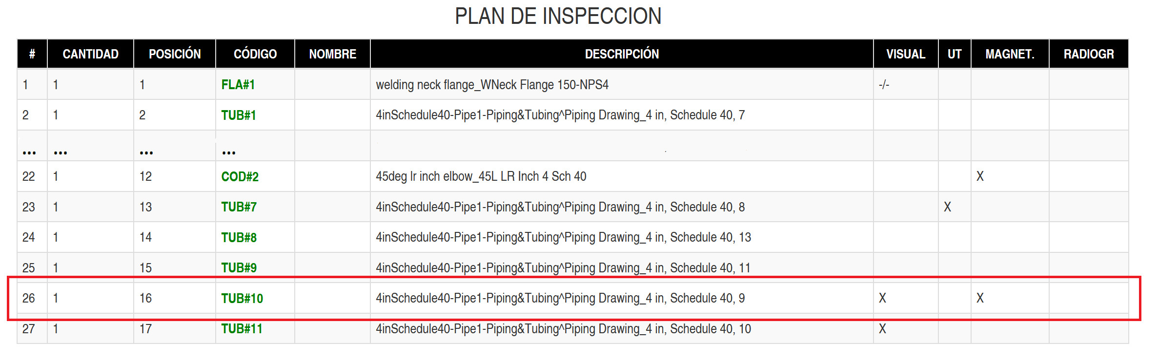 Si se observa el elemento TUB#10 en el plan de inspección se observarla de una manera más clara con una "X" (ya que aun no se ha realizado la inspección), tal como se muestra en la siguiente imagen...