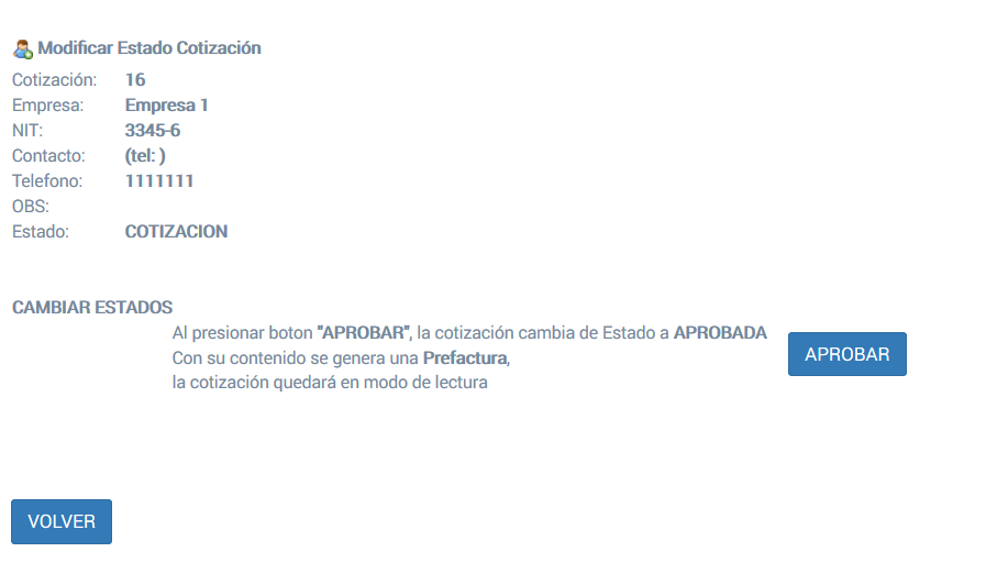Al presionar el botón "APROBAR" la cotización pasa a modo de lectura , su contenido es convertido a pre-factura o pre-cuenta de cobro según sea el caso y estára referenciada en listado de facturas que proviene de Cotización y su Número.
