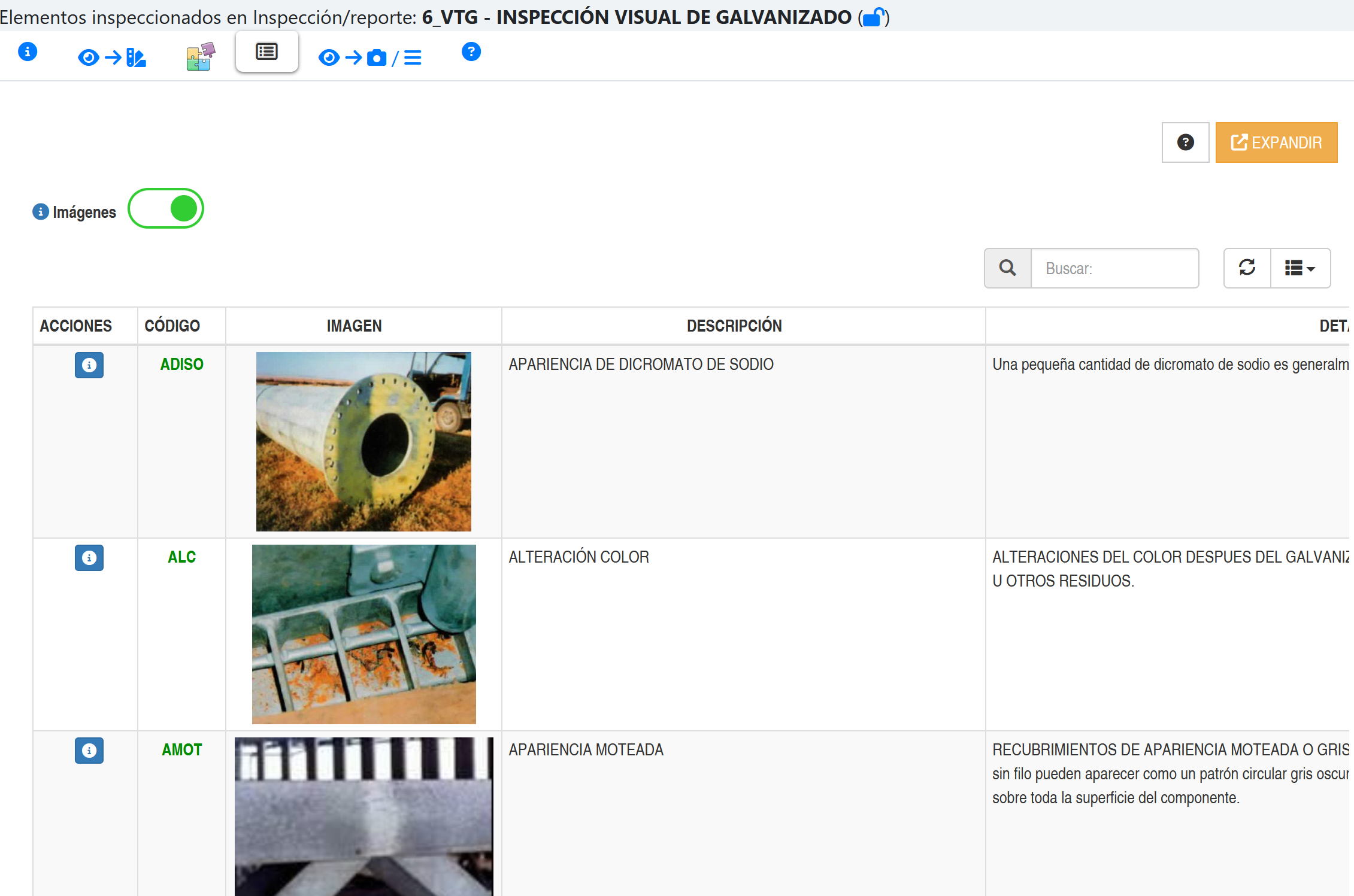 Fig 281 Extracto de pantalla, con listado de indicaciones de un tipo de reporte de inspección END, con opción imagen activada.