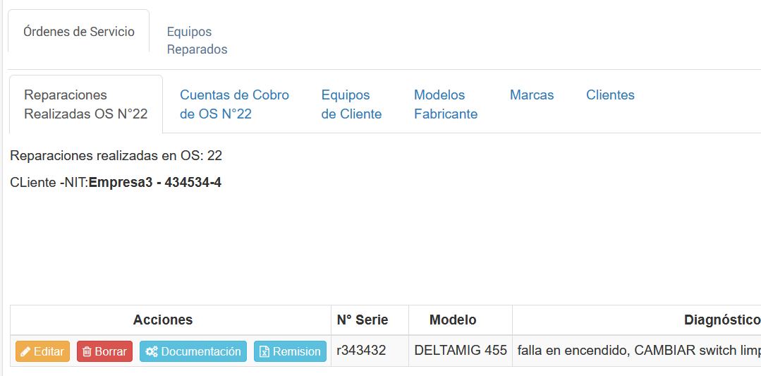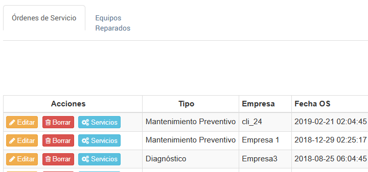 Una vez definida la orden, teniendo en cuenta su tipo, se tendrá ninguna o varias máquinas asociadas a esa orden. Por tal razón cuando se crea la orden, la fila que la representa tiene un botón que permite visualizar los servicios asociados (reparaciones) a la Orden de servicio.