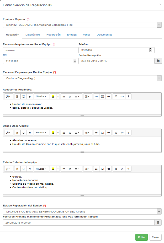 oPestaña Recepción (si no hay variación debe ser lo misma que la orden, pero puede darse el caso que para un deteminado equipo que esta en la orden lo trajo otra persona en otro momento