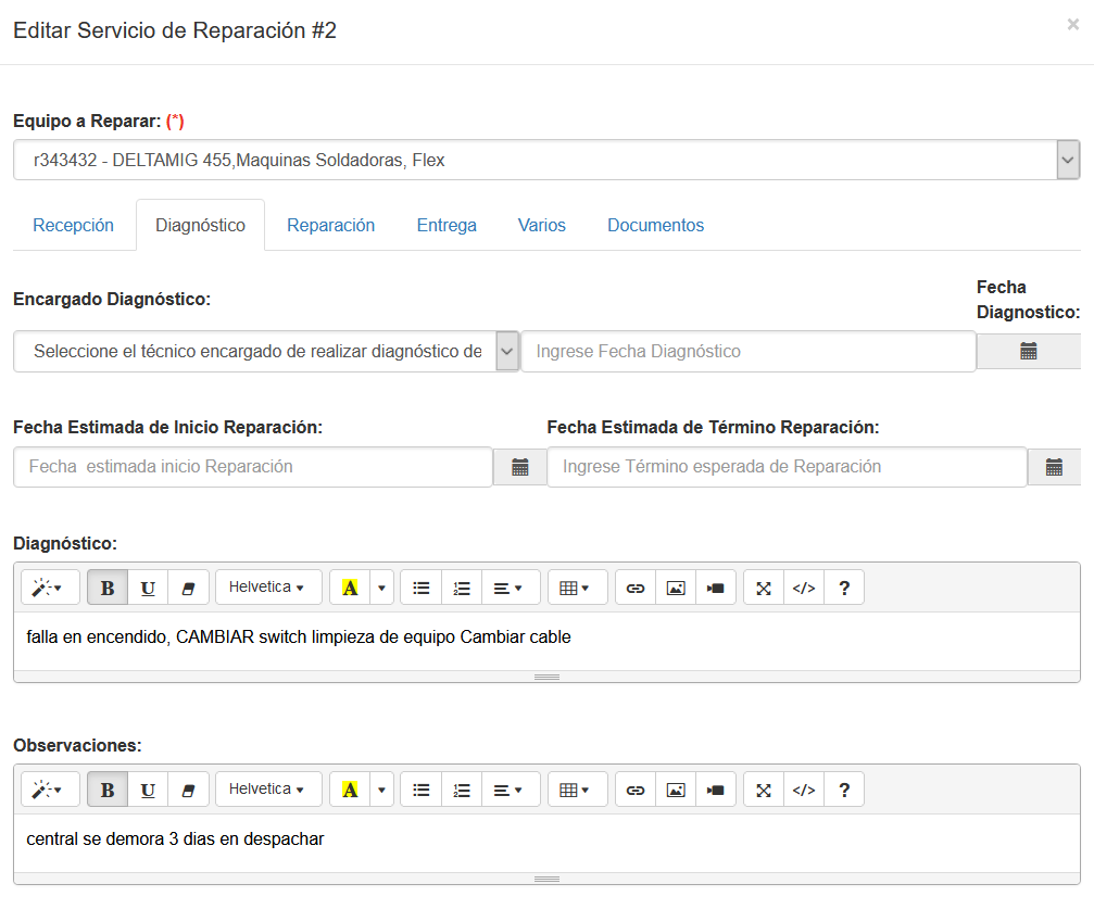 La interfaz de creación, edición de reparaciones de una máquina en una determinada orden de servicio, tiene los siguientes items: