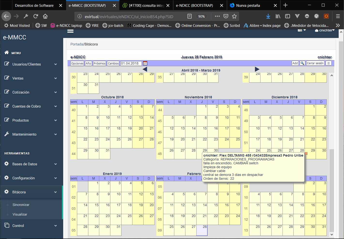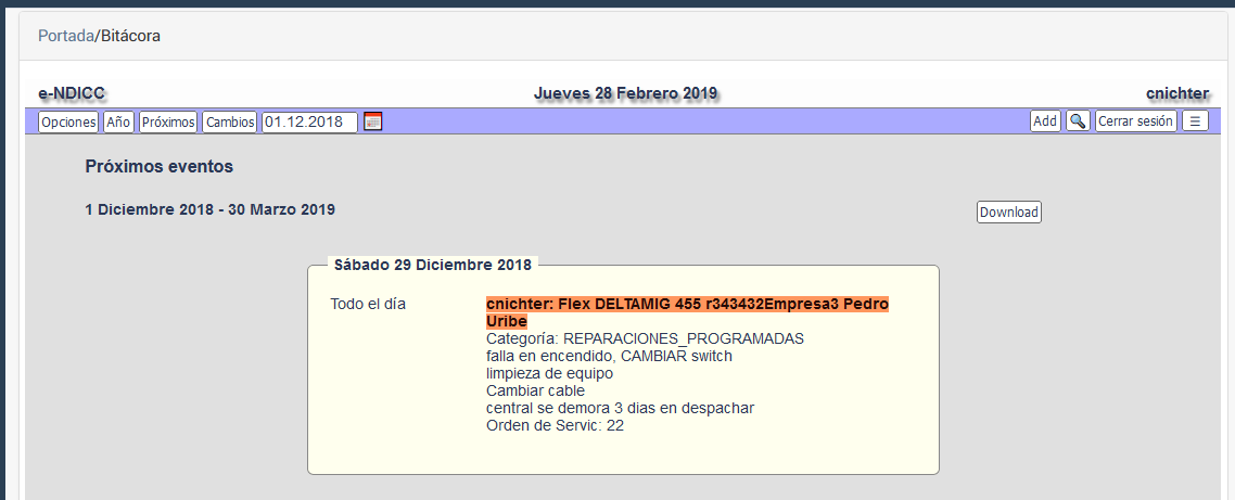 oFecha del próximo mantenimiento (esta fecha se emplea en la bitácora para programación de actividades y se esta trabajando para que se envíe SMS en forma automática.