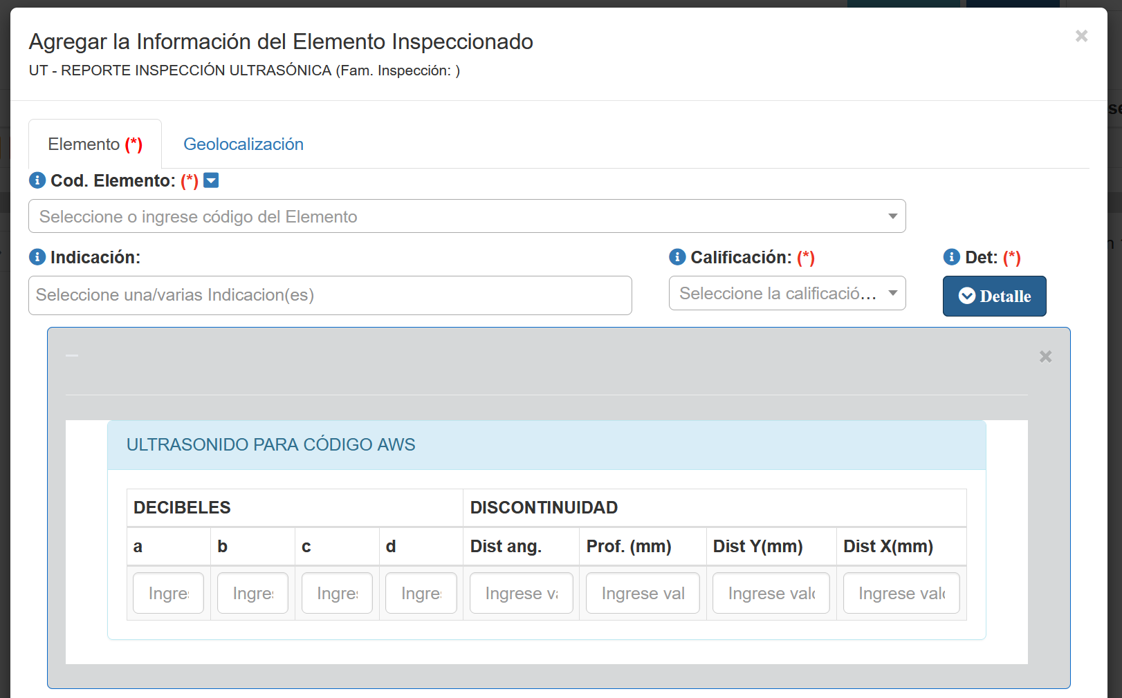 En el método indirecto no es posible emplear las indicaciones antes mencionadas sino que es necesario recurrir al uso de un sub formulario, el cual permitirá definir parámetros para poder describir las indicaciones del elemento inspeccionado, tal como se muestra en la imagen a continuación.