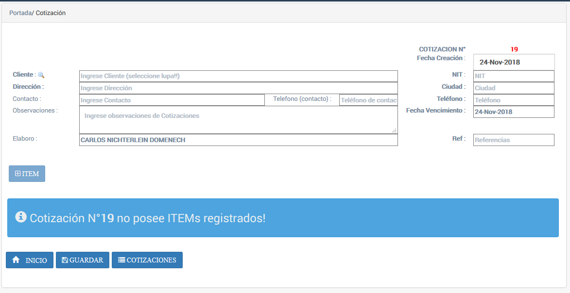 Al seleccionar la opción de menú "nueva cotización" aparece la siguiente pantalla