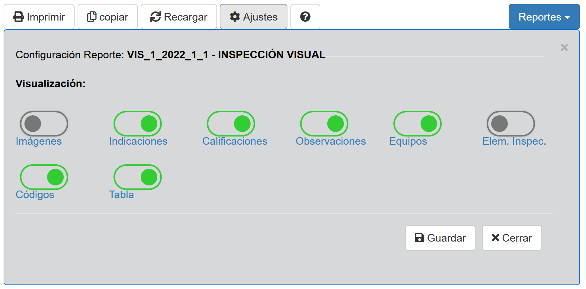Se activa o no la visualización de las opciones de la tabla de Elementos Inspeccionados en este reporte. Más detalles, ver opción Tabla |