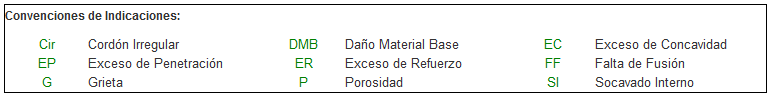 Es importante destacar que no se muestran todas las convenciones de todas las indicaciones definidas para ese tipo de reporte. sino que solamente aquellas que son usadas por el inspector en el reporte.