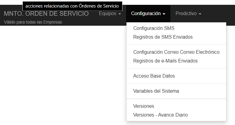e-MMCC/ Mantenimiento de Equipos/ Orden de Servicio Pyme/ Pestaña TODOS/ Ordenes Servicio /Opción Configuración