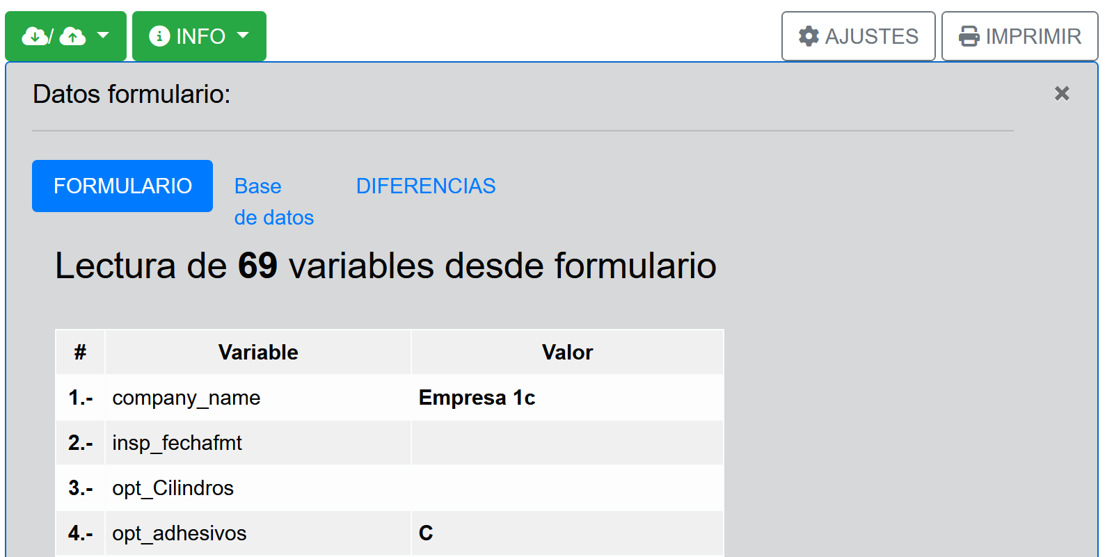 Al seleccionar la opción FORMULARIO se expande una vista informativa indicando una tabla con dos columnas, con el contenido del formulario. En la primera columna va el nombre de la variable y en la segunda el valor, tal como se muestra en la imagen a continuación.