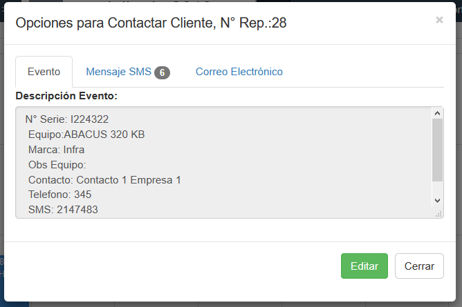 Con datos del Evento de Mantenimiento se prepara un sms para enviar al cliente. Ver información Envío SMS cliente