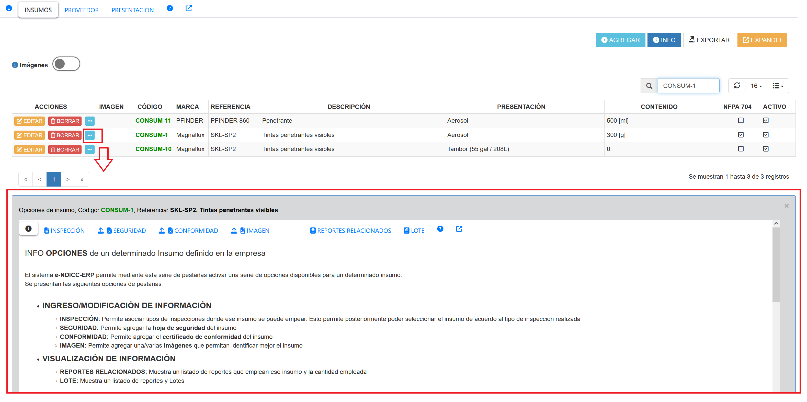Al seleccionar el botón "..." de un determinado INSUMO, aparecerá una ventana detalle con una serie de pestañas que representan las opciones de un determinado insumo, tal como se muestra en la imagen a continuación.