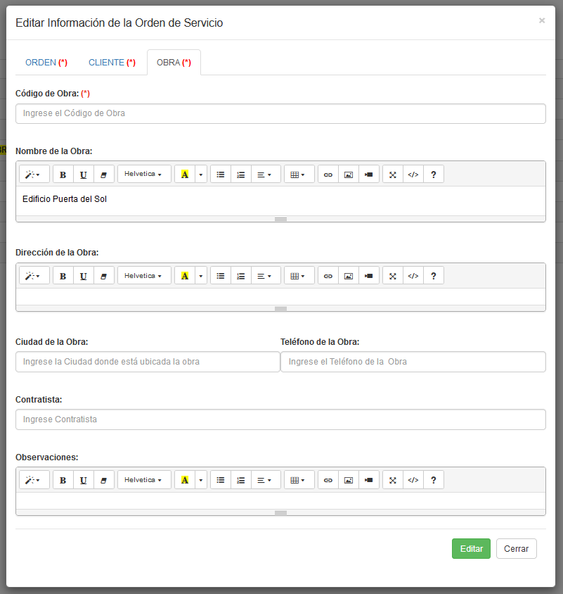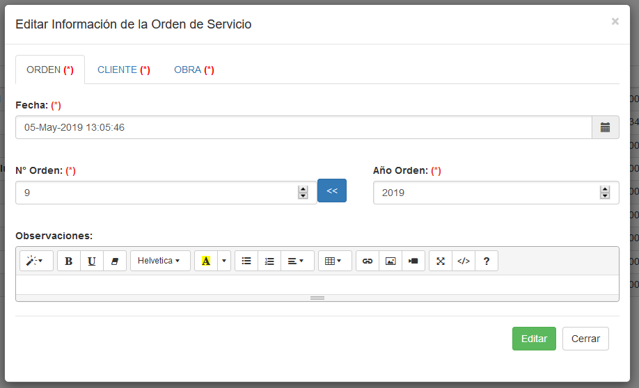 Fig 514 Ventana emergente para ingreso de nueva Orden de Servicio, pestaña ORDEN activa