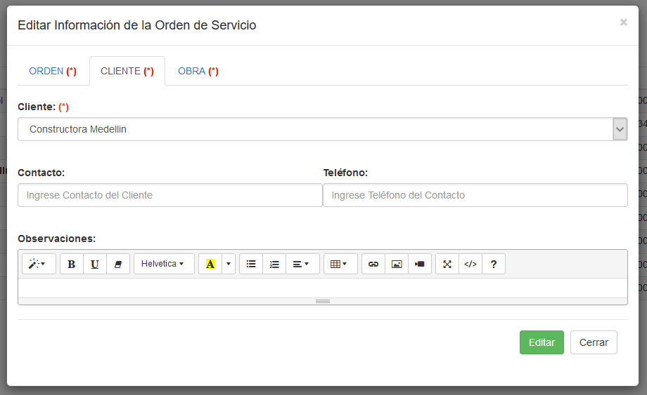 Fig 513 Ventana emergente para ingreso de nueva Orden de Servicio, pestaña CLIENTE activa