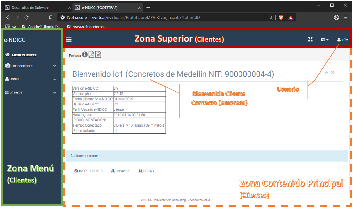Una vez ingresado al sistema en forma exitosa, se produce un inicio de sesión (ver Sesión) y con ello se accede a la pantalla principal del sistema en Modalidad de Cliente.