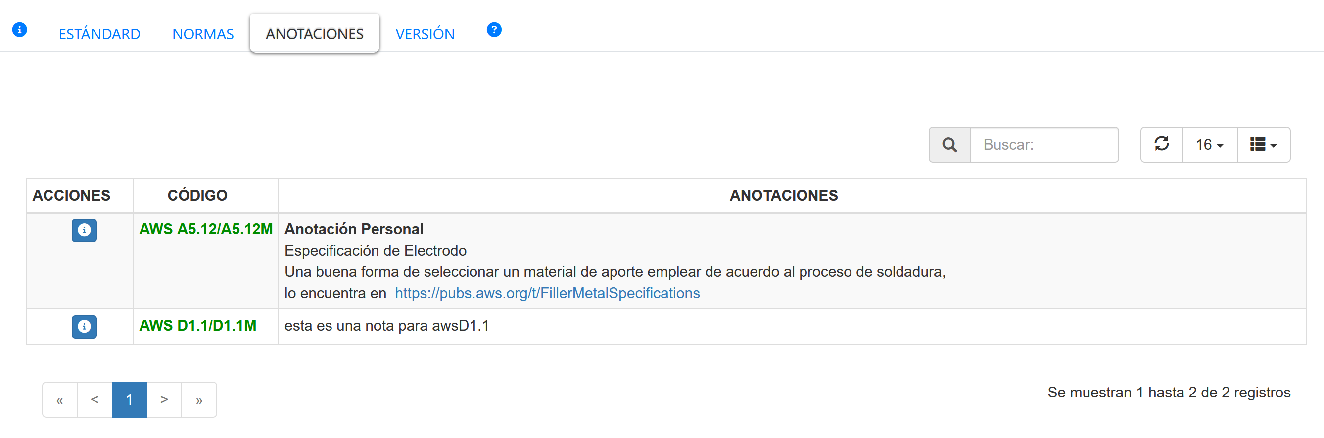 Fig 1527 Extracto de pantalla con listado de anotaciones definidas en el sistema.