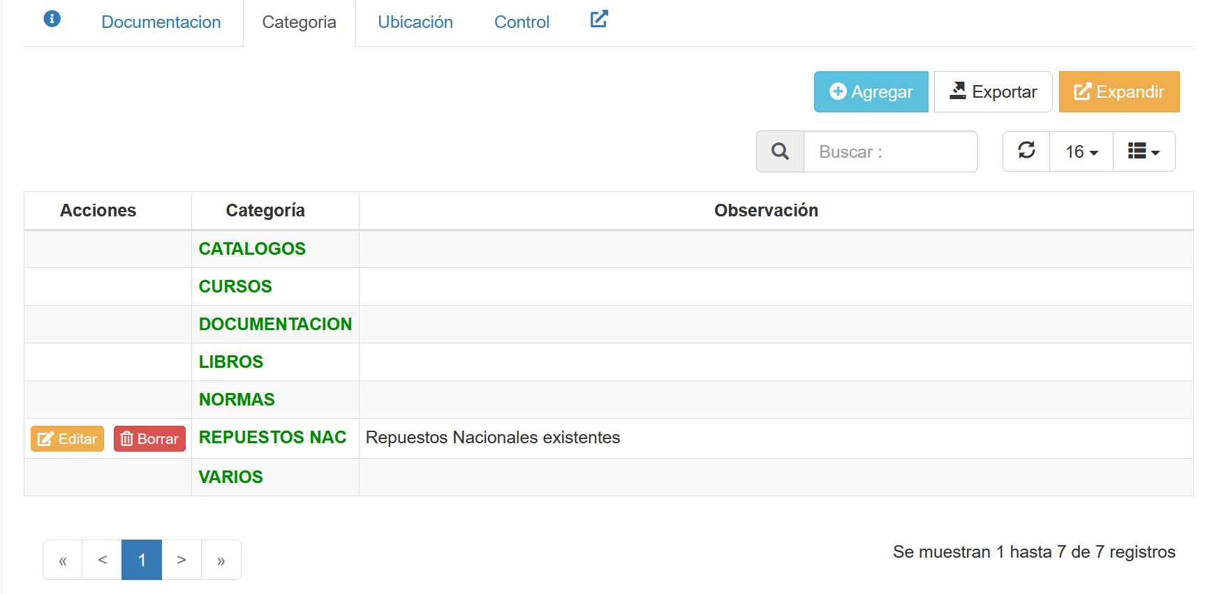 Menú Sistemas Empresas VirtualesMenú HerramientasMenu desplegable ConfiguraciónOpción configuraciónDocumentación Pestaña Categoria Menú Herramientas/Menú Configuración/Opción Configuración/Documentación/Pestaña Categorías. Al seleccionar esta pestaña, aparecerá una pantalla tal como se muestra a continuación. Fig 716 Extracto de pantalla, con listado de Categorías.