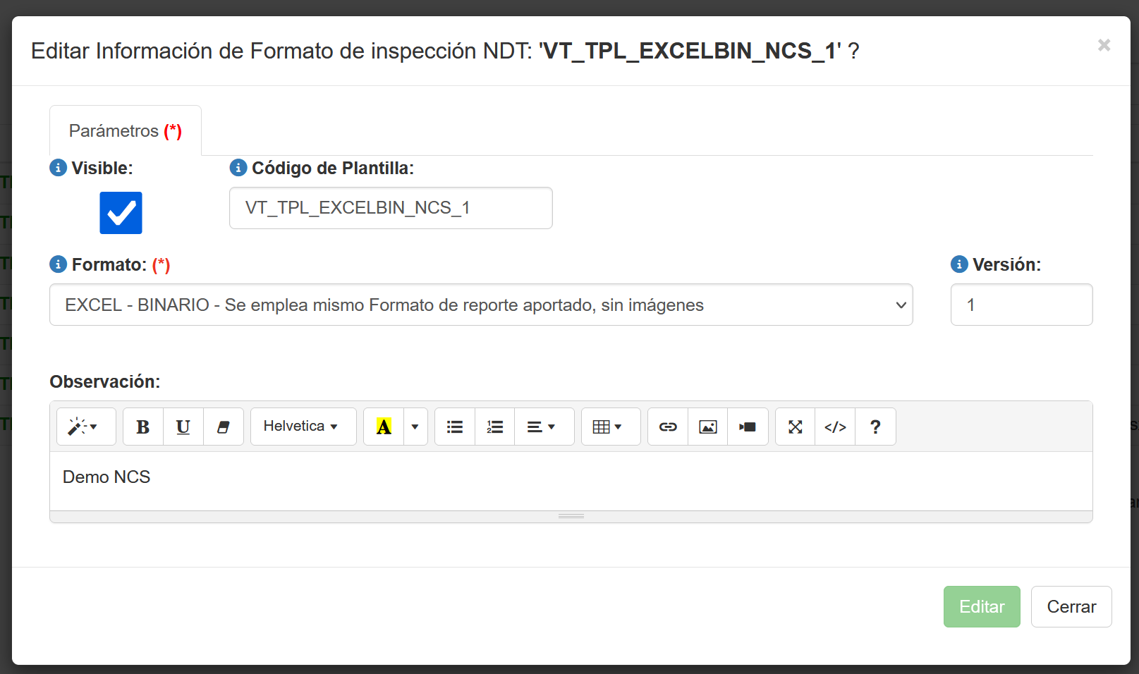 Al presionar el botón Editar aparece una ventana emergente con el siguiente contenido
