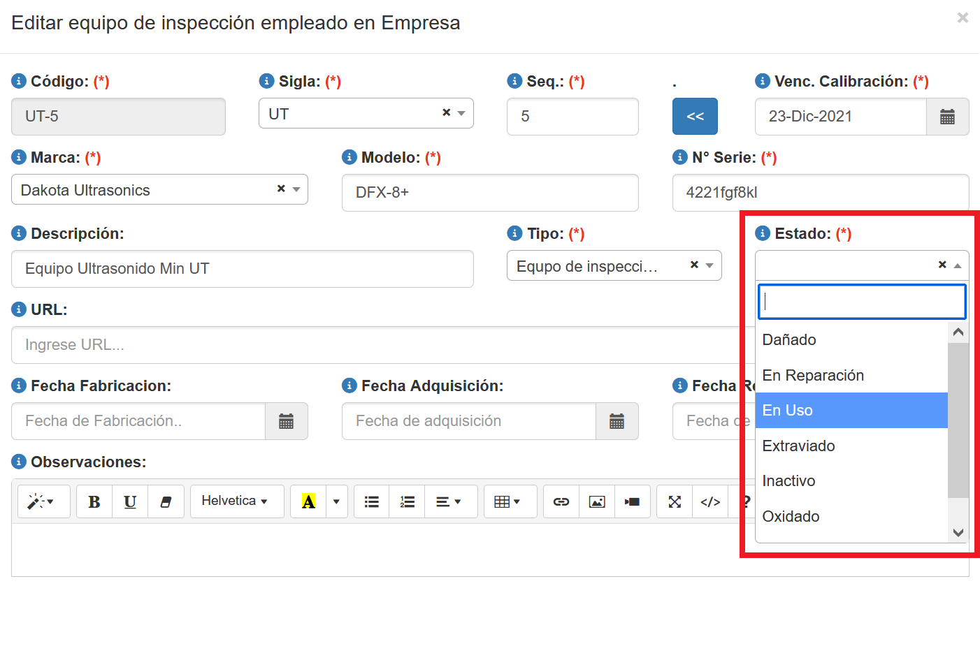 Fig 750 Extracto de pantalla, con listado de Estados de equipos en la definición de un nuevo equipo de Inspección.