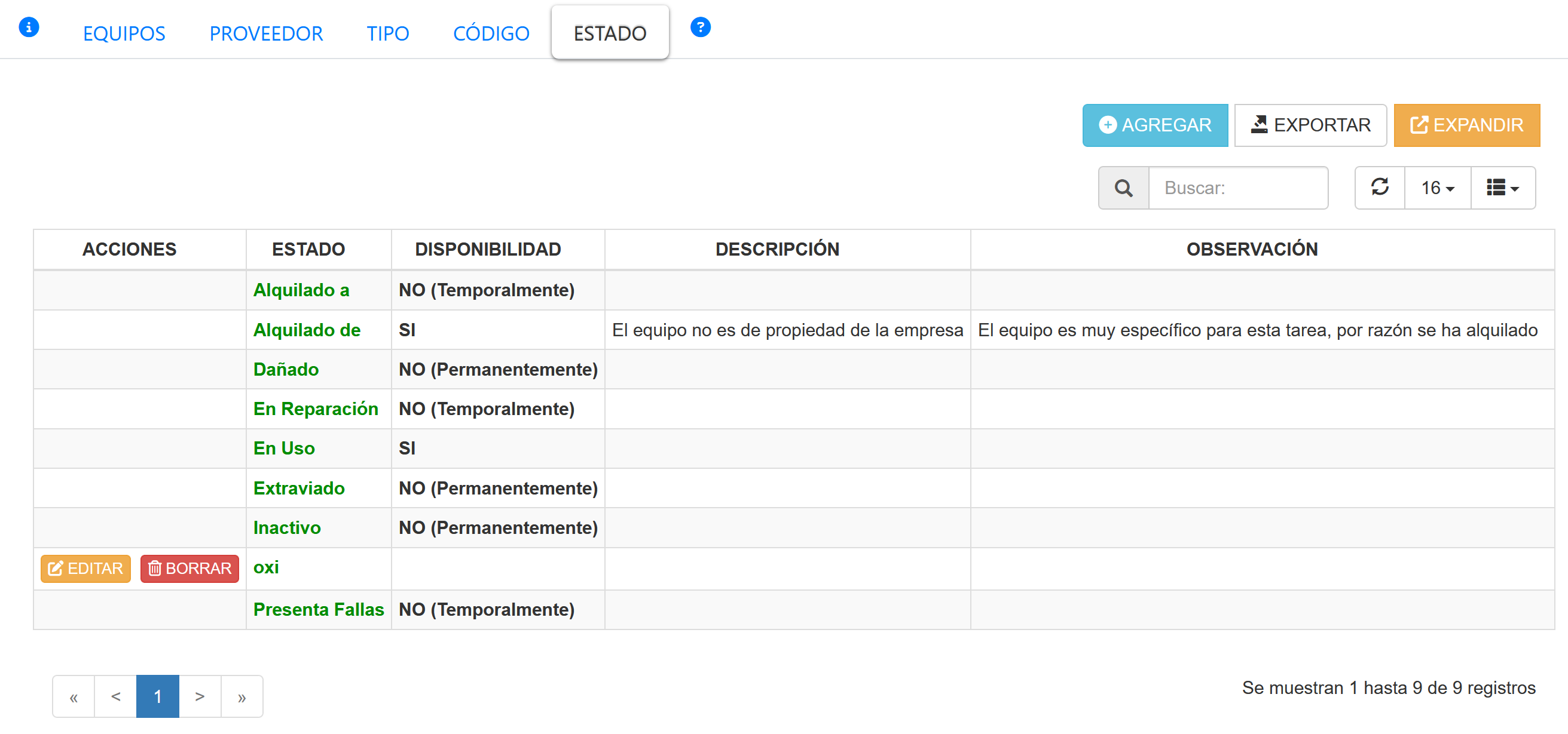 Filtra el contenido de la tabla de Estado de equipo de acuerdo al criterio ingresado en búsqueda. |