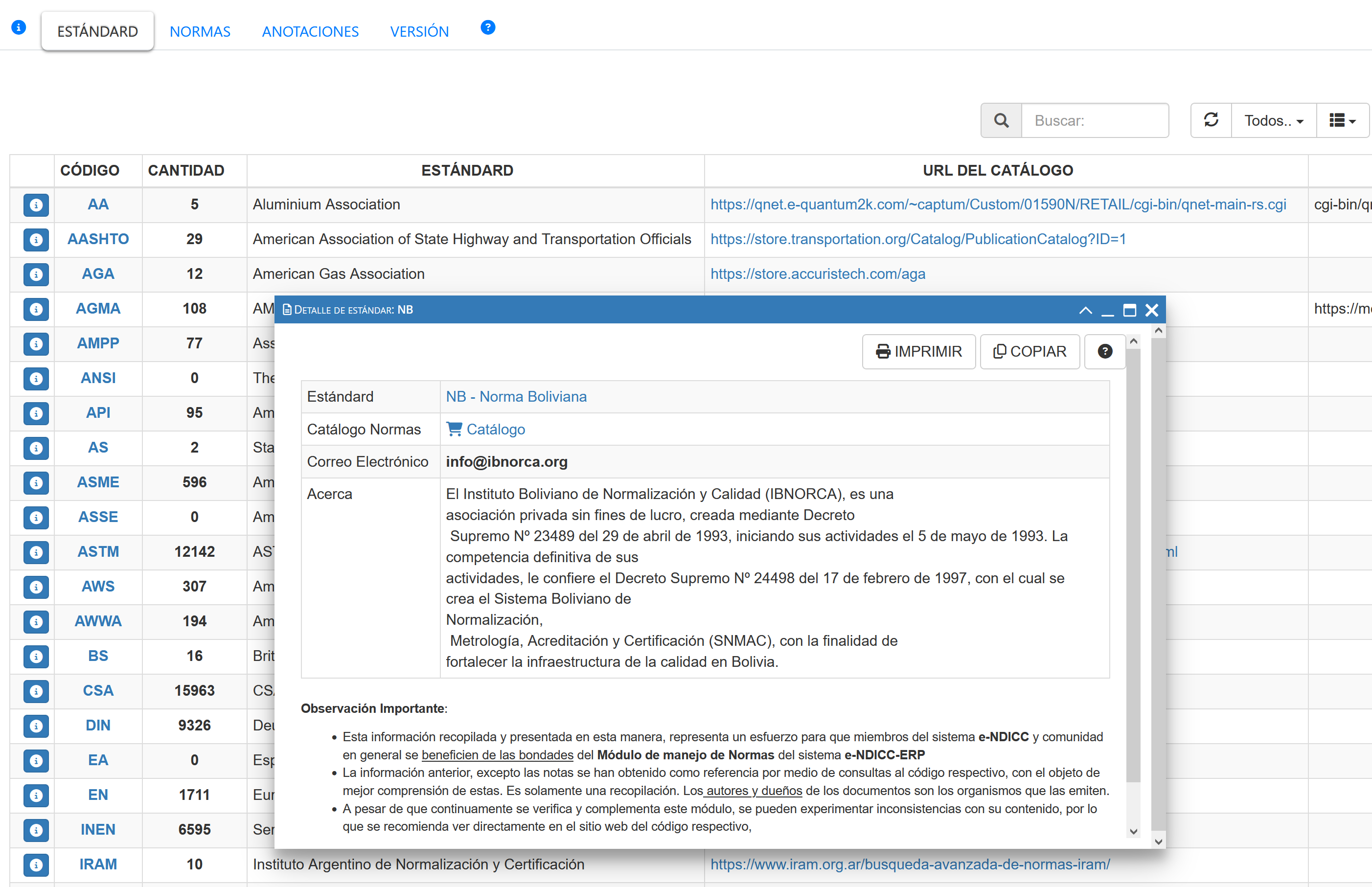 Fig 1525 Extracto de pantalla con listado de estándares u organizaciones con ventana de detalle