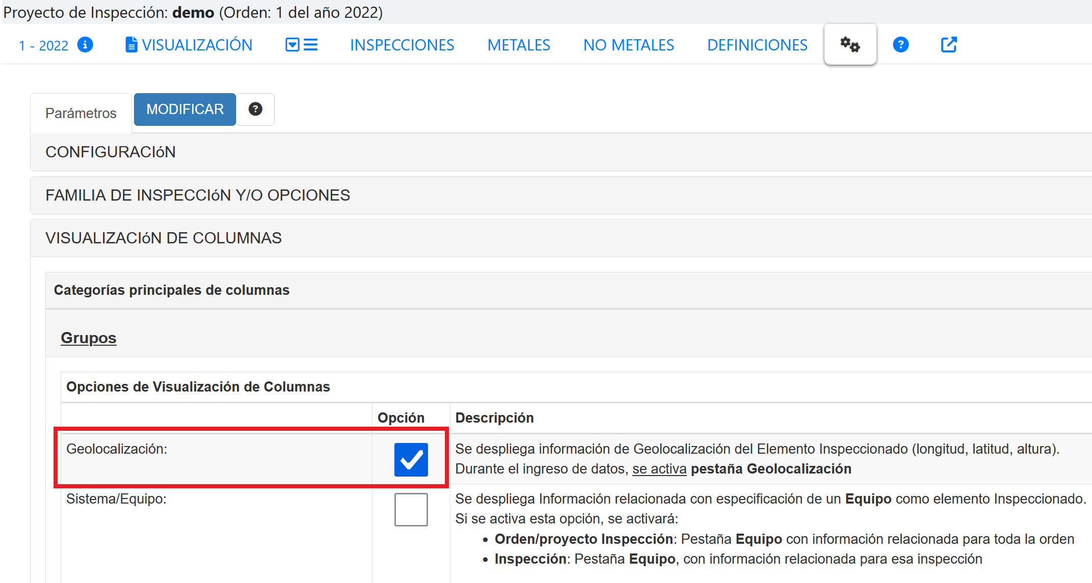 Si la pestaña de Geolocalización no aparece hay que activarla, para ello un usuario con rol administrativo o admintecnico debe ir a configuración de la orden, seleccionar Visualización de columnas, opción General y activar la opción Geolocalización, tal como se muestra en la siguiente imagen. Más detalles ver Opción Configuración Visualización Columnas