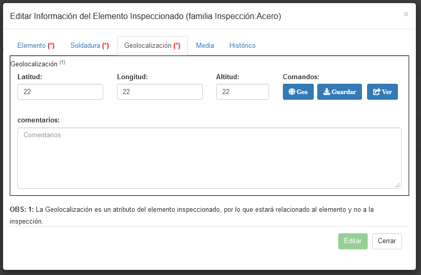 Portada / Orden de Trabajo (OT)/Detalle Orden Seleccionada / Opciones de Familia de Inspección/Visitas de Inspector/Inspecciones/Elementos Inspeccionados/Agregar/Editar/Pestaña Geolocalización