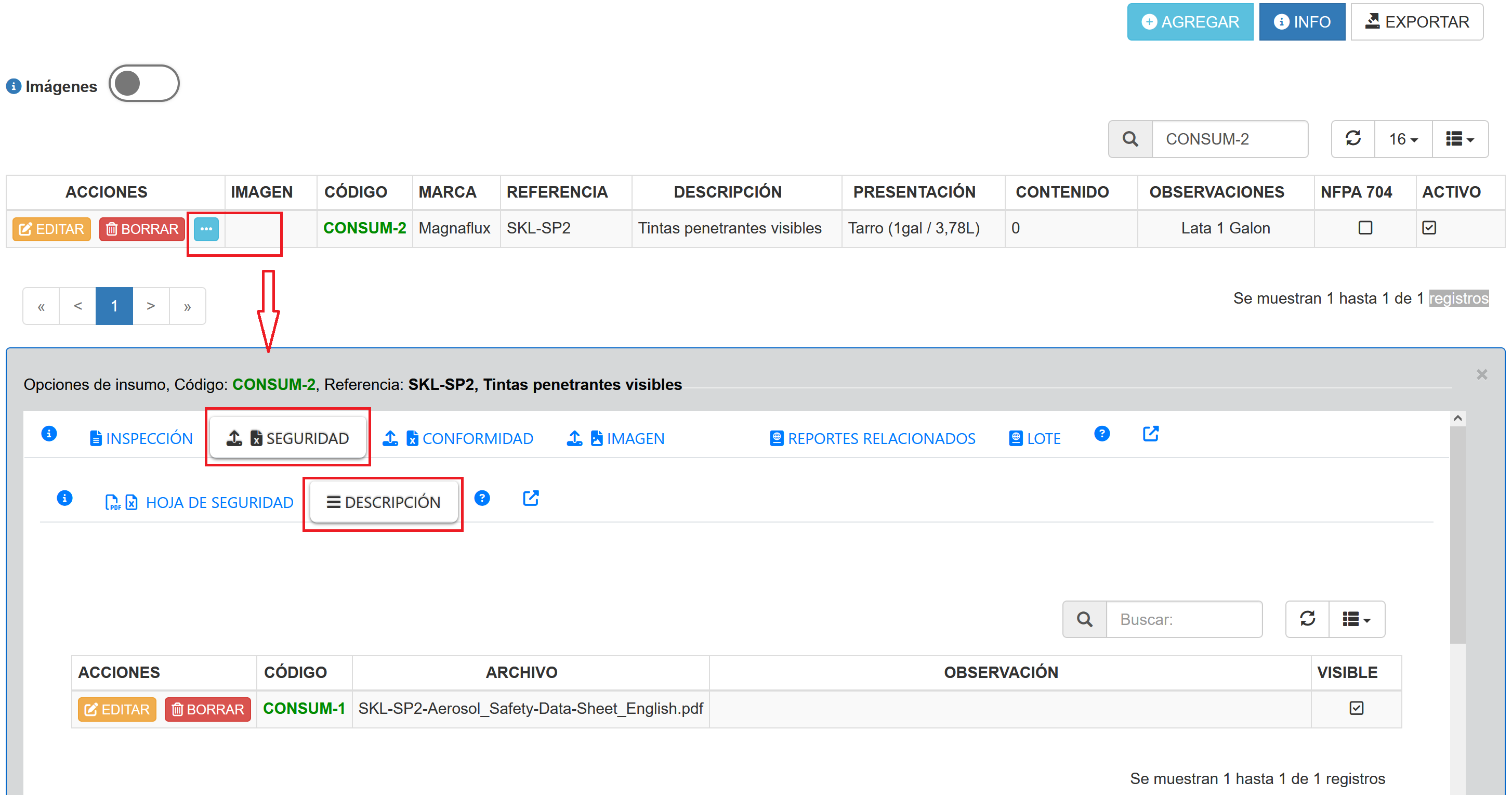 Al seleccionar la pestaña SEGURIDAD de un determinado INSUMO, se muestra una ventana detalle con un segundo nivel de pestañas.
