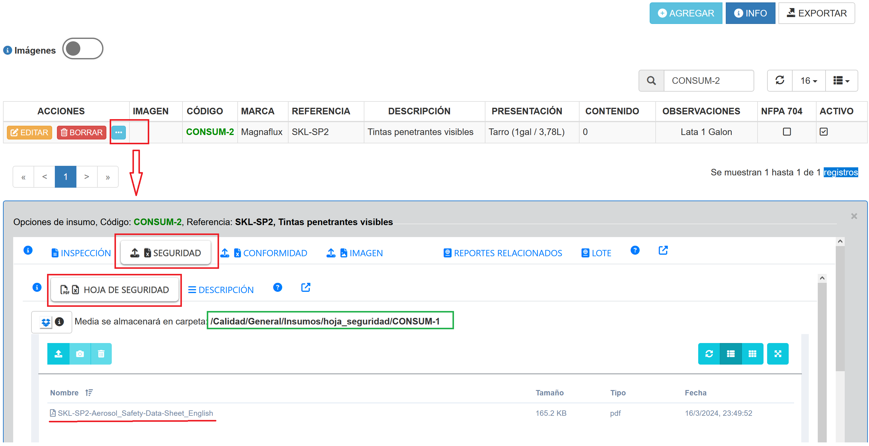oHOJA DE SEGURIDAD: Permite cargar la hoja de seguridad directamente en medio remoto en una carpeta definida por el insumo. Se recomienda usar un formato PDF