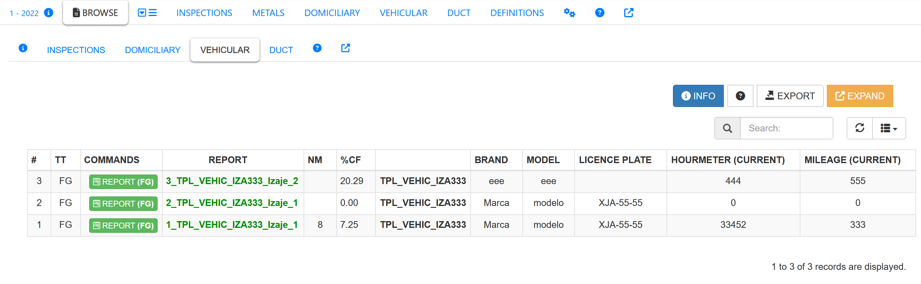 Fig 312 Extracto de Pantalla con listado de reportes de Inspección Vehicular de una Orden/Proyecto de inspección.