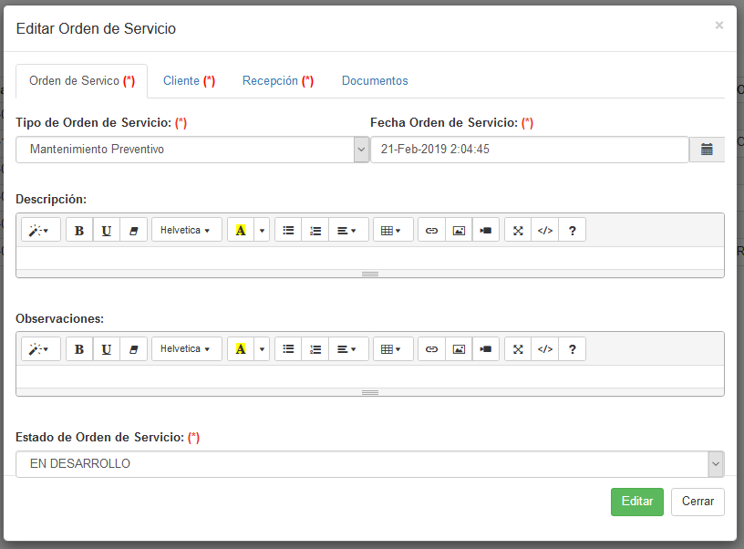 Observaciones Opcional, permite ingresar una observación adicional a esta orden. Se emplea un CAMPO DE TEXTO EDITOR para facilitar ingreso y despliegue de información